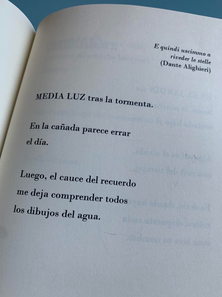 El primer poema de Materia de tiempo prepara al lector para esa aura de contemplación, de intimidad con la naturaleza. Por eso el silencio “despliega sus alas” y, una vez dentro de su reino, es posible escuchar esa “música vaga” que constituye un diálogo con los elementos naturales. Una música formada por el canto de los pájaros, por el “murmullo del viento” o el “tumulto de una abeja”. Hay sonidos en Materia del tiempo, sí; pero no enturbian el silencio, sino que parecen confortarlo. Es la vida la que suena: “canta la sombra”, hay “un diálogo secreto / si llueve sobre la lluvia”, el canto de la fuente se convierte para el poeta en “oración”.
