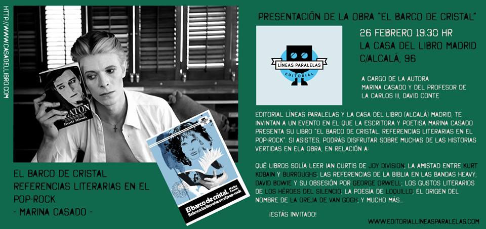 “The Crystal Ship” fue el tema que elegí para titular mi ensayo El barco de cristal. Referencias literarias en el pop-rock, publicado por Líneas Paralelas en octubre de este año. Además de tratarse de un tema compuesto por Jim Morrison, vocalista de The Doors y figura que encarna a la perfección el vínculo esencial entre rock y literatura –fue un voraz lector, poeta y cineasta, y su bagaje cultural se refleja sobradamente en las letras de sus canciones-, la imagen del barco de cristal me sugería una preciosa alegoría en la que el barco representa la música rock, gobernada por capitanes de la talla de Elvis Presley, Chuck Berry, Little Richard, Jerry Lee Lewis… Y más adelante, los míticos Beatles. ¿Por qué de cristal? Porque el cristal permite ver que las tripas de ese barco de rock están hechas de literatura, que tras las letras de canciones que se han hecho famosas se esconden todas las lecturas de sus autores: las estrofas están repletas de guiños a obras y a escritores. Y es que los grandes rockeros fueron también grandes lectores y algunos, como Jim Morrison o Lou Reed, incluso se aventuraron muy decentemente en la escritura. Rock y literatura caminan de la mano, y esta idea constituye la base de mi ensayo, presentado el sábado 13 de diciembre en “Subiendo al Sur”, en lo que se constituyó como un evento inolvidable.