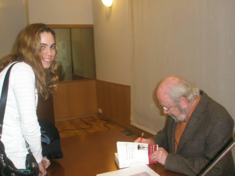 No pretendo detenerme ahora en su biografía –todavía no–, solo tratar de expresar lo que supuso para mí, a mis 21 años, conocer en persona a un poeta que empezaba a admirar: un poeta que empezaba a admirar y que estaba vivo, lo cual me parecía rarísimo y maravilloso. No dudé en llevarme aquel día su poesía completa, titulada Somos el tiempo que nos queda, y a pesar de mi timidez –mucho más acusada en aquel entonces–, conseguí acercarme a él cuando finalizó la conferencia y pedirle que me dedicara el libro. Me daba mucha vergüenza pedirle también una foto y entonces mi padre nos hizo una disimuladamente mientras él firmaba su obra. Y el momento quedó inmortalizado para siempre, con esa ilusión pintada en mi rostro.
